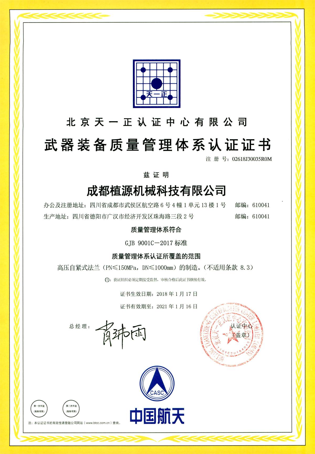 2017年11月,“成都植源”公司迎來(lái)北京天一正認(rèn)證中心有限公司的資深審核員錢紅、韓豫川,對(duì)公司進(jìn)行國(guó)軍標(biāo)GJB9001C-2017的質(zhì)量管理體系認(rèn)證審核。