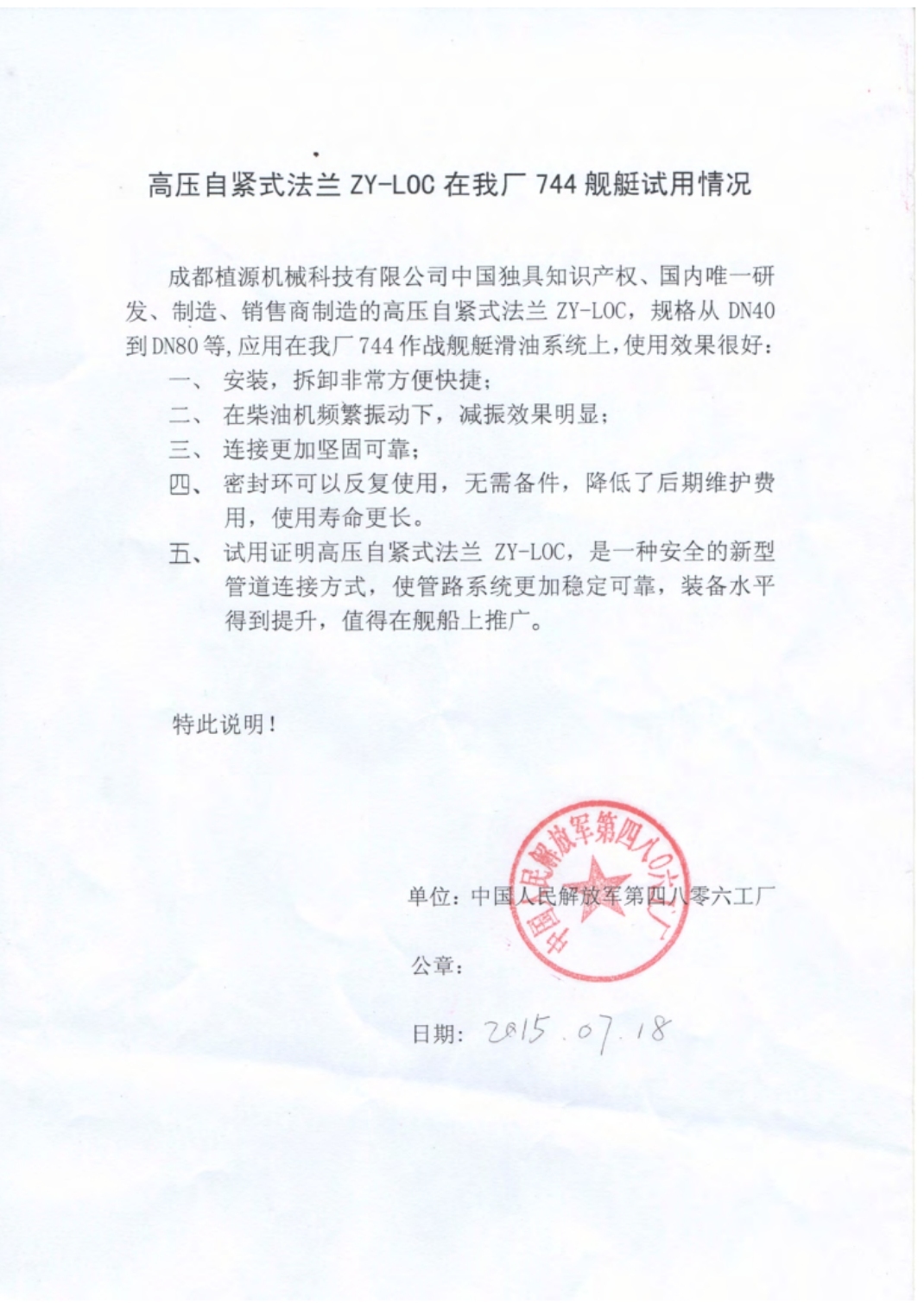 中國(guó)人民解放軍第四八零六工廠使用證明