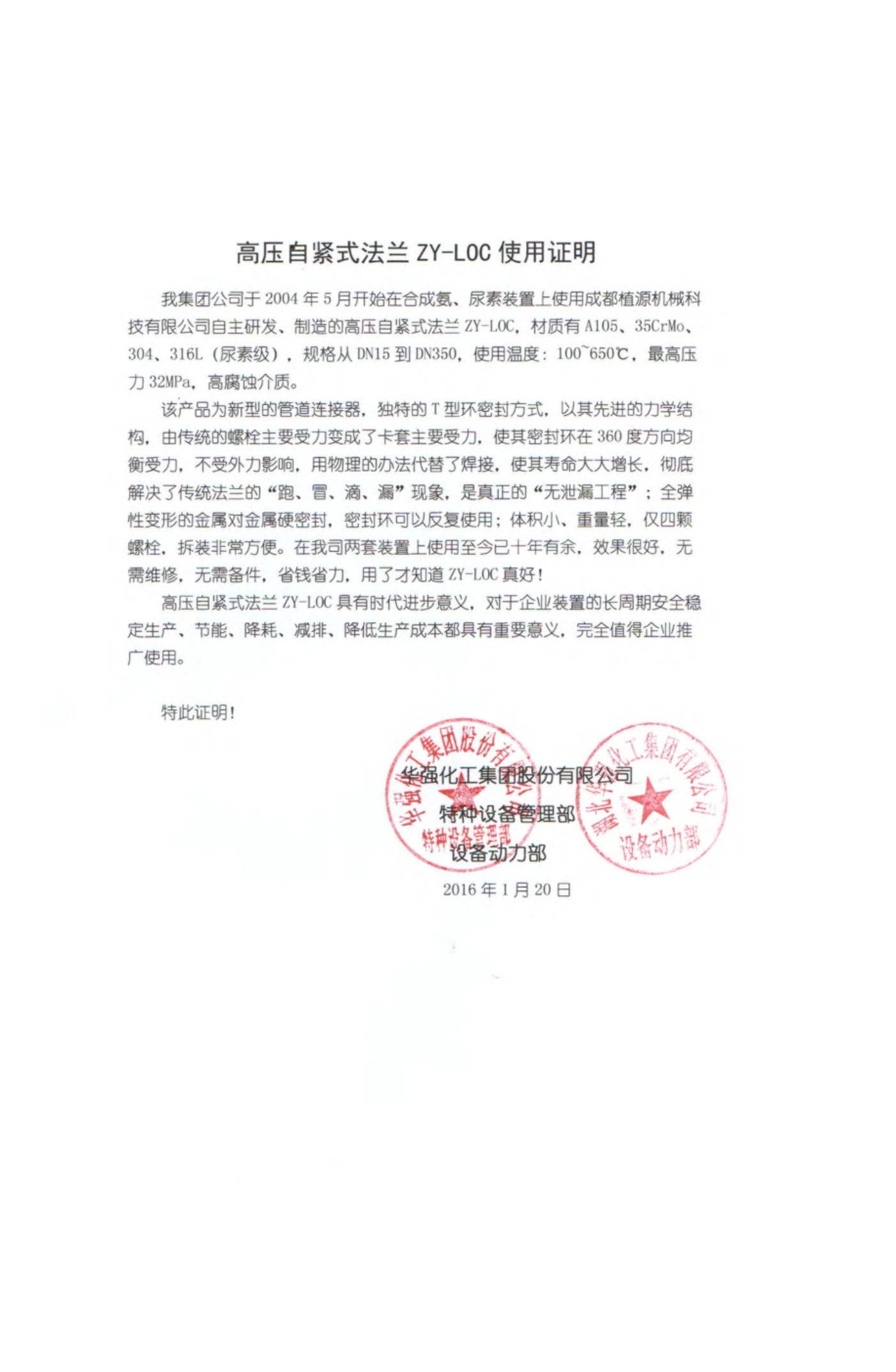 華強(qiáng)化工集團(tuán)股份有限公司使用證明