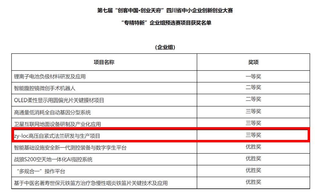 其中,成都植源機(jī)械科技有限公司(以下簡稱“植源公司”)參賽的《zy-loc高壓自緊式法蘭研發(fā)與生產(chǎn)項(xiàng)目》榮獲大賽三等獎(jiǎng)。